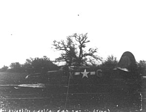 Ploughing in a field nearby was Miss Thora Barrett (now Mrs Thora Pitman) a Land Army girl employed by Mr Giddings who owned the Crowood estate near Ramsbury. She recalls: "I suddenly noticed several Americans in a Jeep bouncing across the field towards me. They stopped and asked if I'd seen a plane crash. I said yes, and started to tell them about the mid-air collision I had witnessed the previous day (see C-47 Witcha). 'No', 'No', they said, we're looking for a plane that crashed about five minutes ago. I had not seen or heard any aircraft that morning and told them so. They thanked me and clambered back into their Jeep. However, just before they drove off I noticed a fighter plane stuck in a hedge nearby and asked them if that was what they were looking for?"