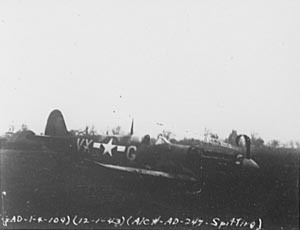 Below: Spitfire AD247 looking rather sorry for itself following a wheels up landing on 1st December 1943 in a ploughed field near Marridge Hill.