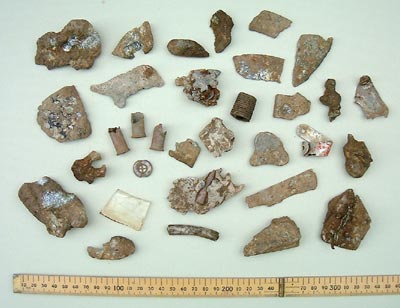 Above: All the fragments we found during the course of one mornings metal detecting. They include .303 ammunition dated 1941 and 1942, Perspex, uniform button, solidified lumps of aluminium, hydraulic fluid pipe and a surprising amount of lead!